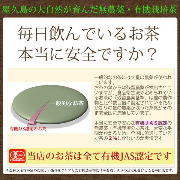 屋久島の雄大な自然の恵みに育まれた無農薬・有機栽培のお茶です。